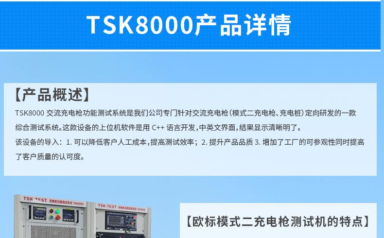 TSK8000交流充电枪功能测试系统是我们公司专门针对交充电枪(模式二充电枪、单相、三相32A交流充电桩)定向研发的一款综合测试系统。这款设备的上位机软件是用C++语言开发,中英文界面,结果显示清晰明了。